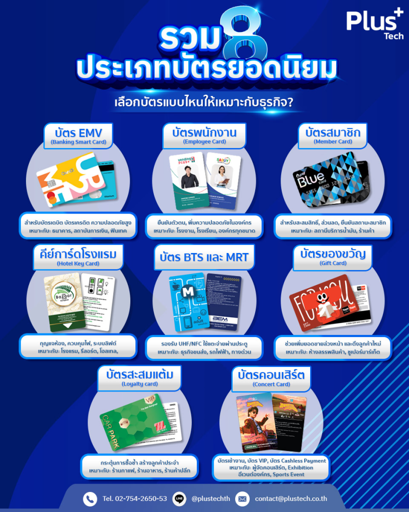ท้ายที่สุด ไม่ว่าธุรกิจของคุณจะอยู่ในอุตสาหกรรมใด การเลือกบัตรให้เหมาะกับธุรกิจ คือการลงทุนที่ส่งผลต่อทั้งประสบการณ์ผู้ใช้งาน ความปลอดภัย และภาพลักษณ์องค์กรในระยะยาว เมื่อเลือกได้ตรงประเภท บัตรแต่ละใบจะกลายเป็นเครื่องมือที่ช่วยขับเคลื่อนธุรกิจได้อย่างมีประสิทธิภาพ Plustech พร้อมให้คำปรึกษาและพัฒนาโซลูชันสมาร์ทการ์ดครบวงจร เพื่อให้บัตรของคุณตอบโจทย์และคุ้มค่าที่สุดในทุกมิติธุรกิจ